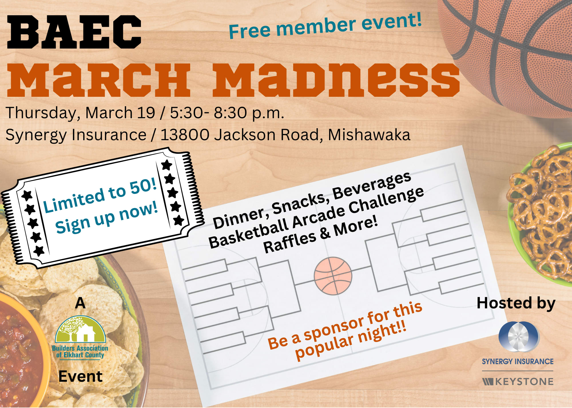 Enjoy this 'mad' evening! This BAEC event is fabulously hosted each year by Synergy Insurance. There will be delicious food, snacks, desserts and beverages. And if this is your first BAEC March Madness event, you will have the opportunity (for a nominal fee) to participate in the highly competitive, highly fun basketball arcade championship (sometimes you have no choice)! It's bracketed, and often boisterous! You won't be disappointed... and you could win the coveted arcade trophy! On the more sedate side, fill out form with your guesses as to a variety of questions about the games being broadcast on the big screens that evening...Who will be the tip-off winner? Who will be the first to score? Who will be the leader at the half?, etc. The card costs $10 and if you win, you will split the winnings with the PAC. There are several free raffles with great prizes supplied by the folks at Synergy Insurance, as well as a very nice door prize offered by Bryan Yeske, Mr. Handyman! Sign up today!